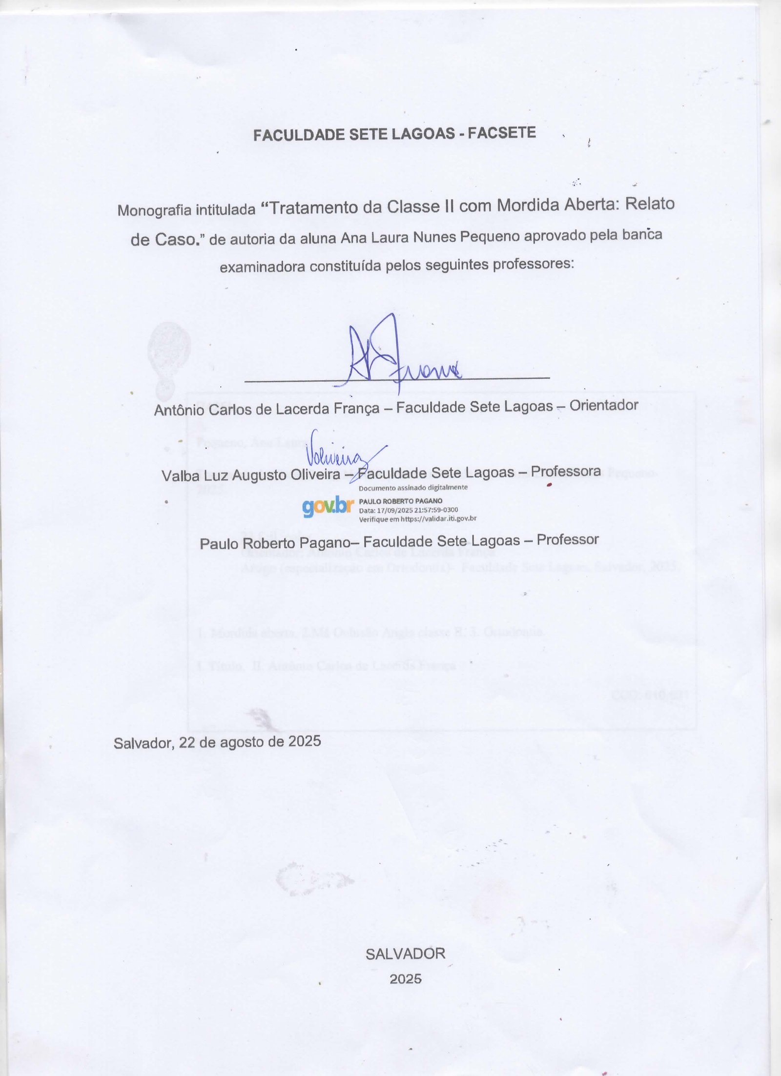 As más oclusões de Classe II com mordida aberta anterior (MAA) são caracterizadas por uma discrepância ântero-posterior entre as bases ósseas maxilar e mandibular, que pode decorrer de uma posição mais anterior da maxila, de uma posição mais posterior da mandíbula ou de uma combinação de ambas, além do trespasse vertical negativo dos dentes anteriores em máxima intercuspidação. A etiologia dessa condição é multifatorial, o tratamento da MAA varia de acordo com sua etiologia e a idade dentária do paciente, muita das vezes é tratada na dentição mista com aparelhos ortopédicos, porém em casos de insucesso a ortodontia fixa é a indicação na dentição permanente. Neste trabalho a paciente apresentava na dentição permanente com má oclusão de classe II com mordida aberta anterior dentária por hábito parafuncional, o tratamento foi realizado por meio de uso de aparelho ortodôntico corretivo fixo, extração dos dentes 14 e 24, retração em massa dos dentes anteriores com ancoração esquelética, elásticos intermaxilares e o aparelho miofuncional Myobrace, que tinha como função reeducar e impedir o hábito parafuncional. O caso foi finalizado com sucesso, apesar das dificuldades encontradas ao longo do tratamento, especialmente quanto à colaboração no uso de alguns dispositivos auxiliares. Ainda assim, foi possível alcançar melhorias significativas na oclusão da paciente, como a resolução da má oclusão de Classe II, melhor posicionamento dos dentes anteriores em suas bases ósseas e fechamento da mordida aberta anterior. A paciente também foi encaminhada para reabilitação oral, finalizando o tratamento com restauração funcional e estética satisfatória.