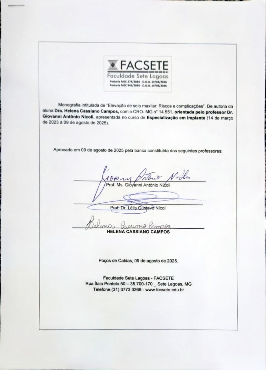 A elevação do seio maxilar é um procedimento muito comum na área de implantes dentários, especialmente em casos em que houve perda significativa de osso na parte posterior da maxila. O objetivo deste estudo foi investigar os principais riscos e complicações que podem surgir durante essa cirurgia, através de uma revisão da literatura pertinente ao assunto. Foram analisados artigos publicados entre 2012 e 2025 em bases de dados como PubMed, SciELO, BVS e Google Scholar. A análise revelou que a perfuração da membrana sinusal de Schneider é a complicação mais frequente, seguida por infecções, migração de enxertos e sinusites. Além disso, fatores como a presença de septos ósseos, a espessura da membrana e a falta de exames de imagem antes da cirurgia podem aumentar as chances de problemas. Por outro lado, técnicas menos invasivas, como a abordagem transcrestal, têm apresentado taxas menores de complicações, embora exijam mais habilidade do cirurgião. Portanto, o sucesso desse procedimento está diretamente relacionado ao planejamento cuidadoso, à formação do dentista e ao uso de tecnologias avançadas, como a tomografia computadorizada de feixe cônico (TCFC), que permite uma avaliação mais precisa da anatomia da região.