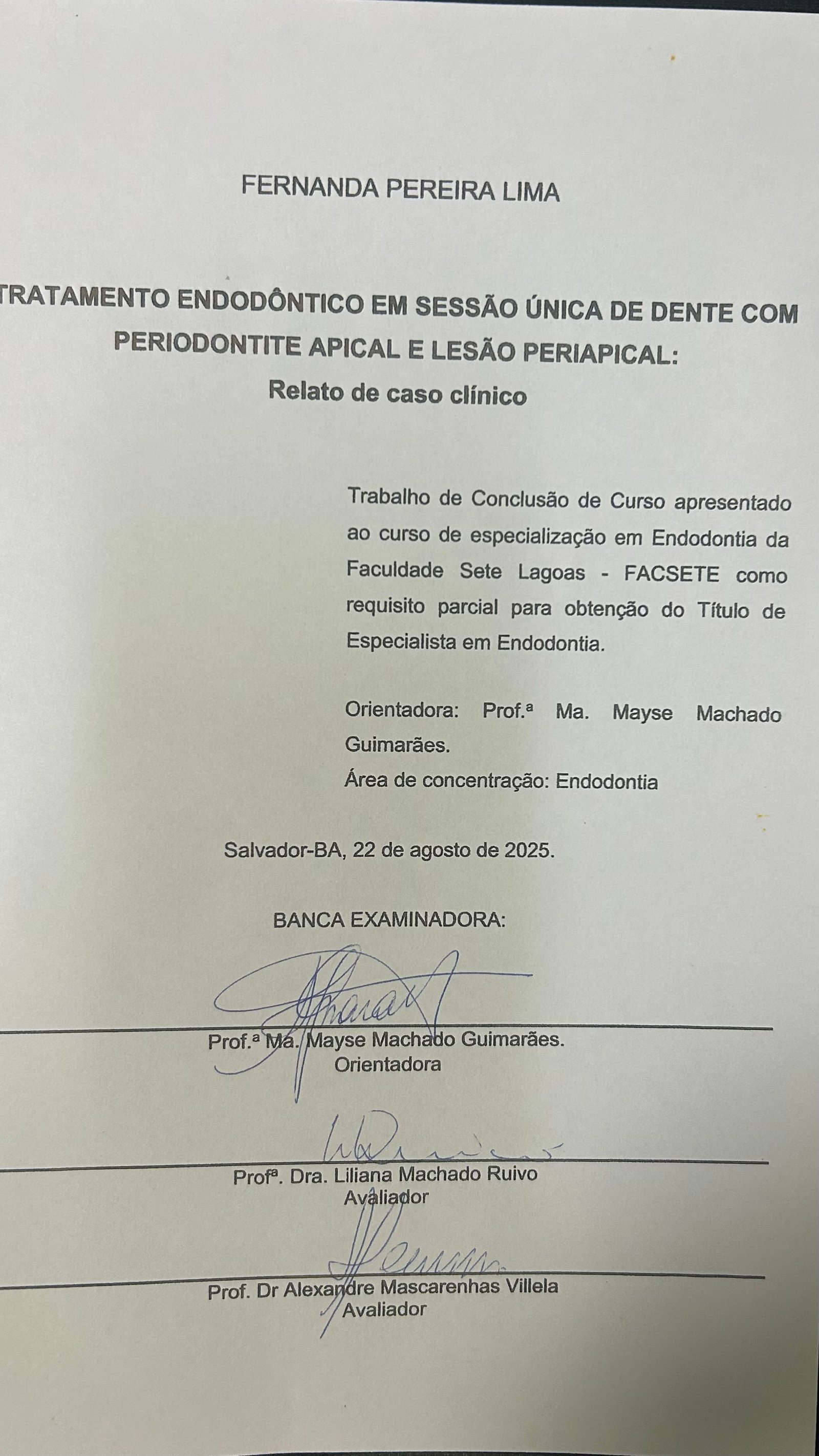 A Endodontia é a especialidade da Odontologia responsável pelo estudo daanatomia interna dos dentes, incluindo a cavidade pulpar e os tecidosperirradiculares. O tratamento endodôntico tem como objetivo a desinfecção doscanais radiculares, utilizando limas mecanizadas e soluções antimicrobianas, a fimde promover o reparo tecidual. Este trabalho apresenta o relato clínico de umsegundo molar inferior esquerdo (dente 47), diagnosticado com periodontite apicalsintomática associada a lesão periapical, tratado por meio de terapia endodônticarealizada em sessão única. O paciente procurou atendimento no Curso deEspecialização em Endodontia (CENO), em Salvador. Ao exame clínico, observouse presença de material restaurador na unidade dentária, ausência de edema efístula, resposta positiva à percussão, negativa à palpação e ausência de respostaao teste térmico com Endo Ice. A radiografia periapical revelou imagem sugestiva delesão periapical circunscrita. O tratamento consistiu no preparo biomecânico doscanais com lima reciprocante PRO-R 25.08 e lima rotatória 35.04 Univy, irrigaçãocom hipoclorito de sódio a 2,5% e ativação sônica com o sistema EndoActivator. Aobturação foi realizada por meio da técnica termoplastificada, utilizando cimentoendodôntico AH Plus, seguida do selamento coronário com resina composta. Apóscinco meses, a paciente retornou assintomática, sem sinais clínicos de infecção. O