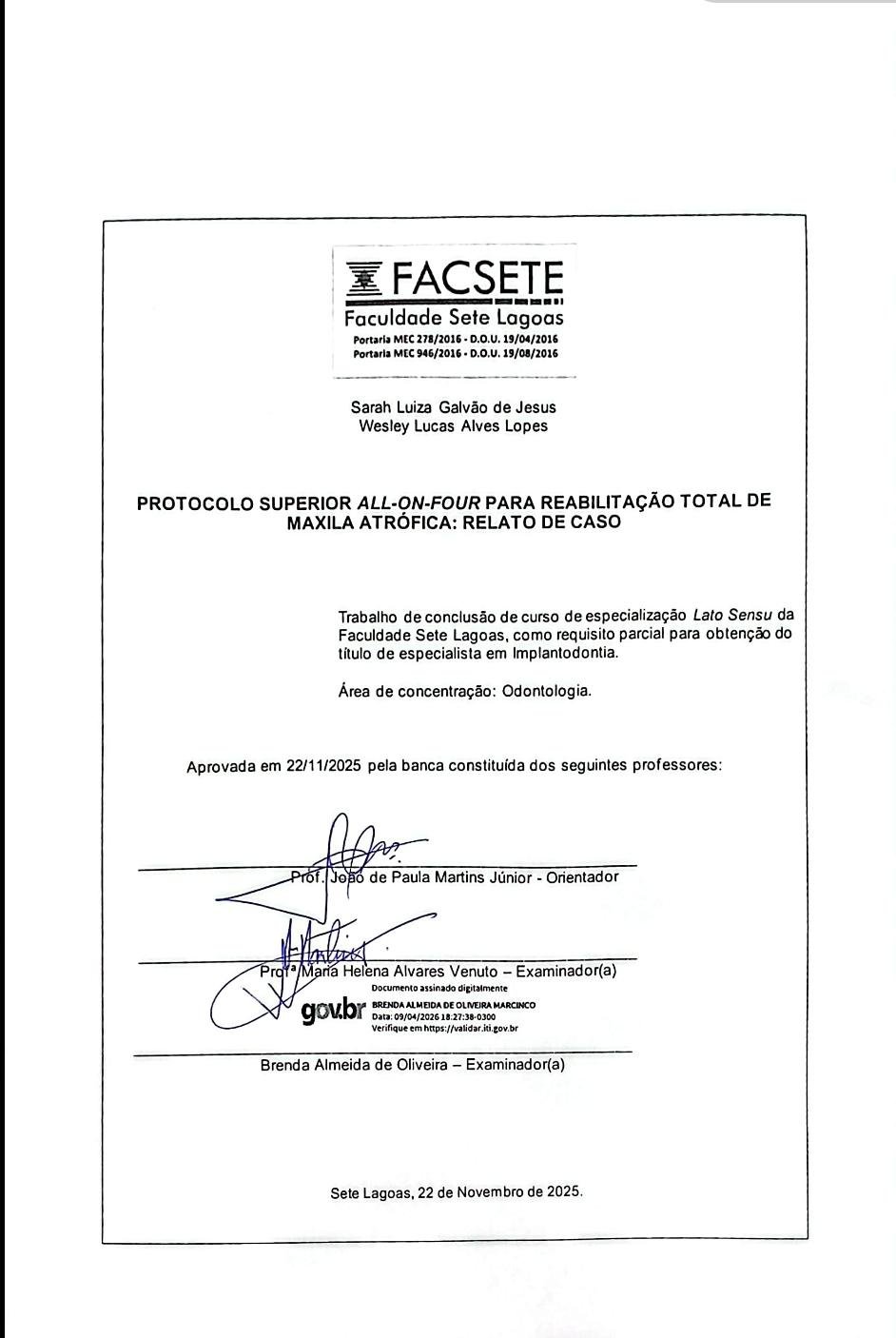 deste estudo é relatar o caso de uma paciente submetida a reabilitação total superior, com prótese do tipo protocolo, seguindo os parâmetros cirúrgicos all on four, em maxila atrófica. O caso relatado demonstrou que a reabilitação total da maxila atrófica utilizando a técnica All-on-4 é uma abordagem viável, previsível e funcionalmente eficaz, desde que executada seguindo criteriosamente todos os preceitos descritos na literatura. O resultado clínico e radiográfico evidenciou boa adaptação protética, saúde peri-implantar preservada e satisfação plena da paciente, tanto funcional quanto estética. Assim, o caso apresentado reforça que a técnica All-on-4, quando planejada e executada com precisão, oferece benefícios significativos ao paciente, incluindo melhora da função mastigatória, conforto, segurança e estética facial.