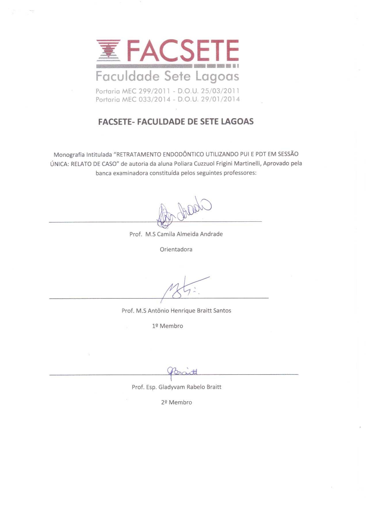 amplitude 30% a 2 milímetros do comprimento de trabalho e sem tocar nas paredes. APDT foi realizada com o canal preenchido com 1ml de azul de metileno chimiolux à0,05%, aguardando um período de 5 minutos. Foi dada uma descarga de laser de 820micrometros, com o aparelho XT por 80 segundos. Finalizou-se com obturaçãoutilizando cone de guta percha Wave one Large termoplastificado com gutta condenson° 60 e selamento com cimento provisório. Conclui-se que, o retratamento endodônticoem sessão única, neste caso clínico, utilizando PUI e PDT obteve sucesso clínico eradiográfico.